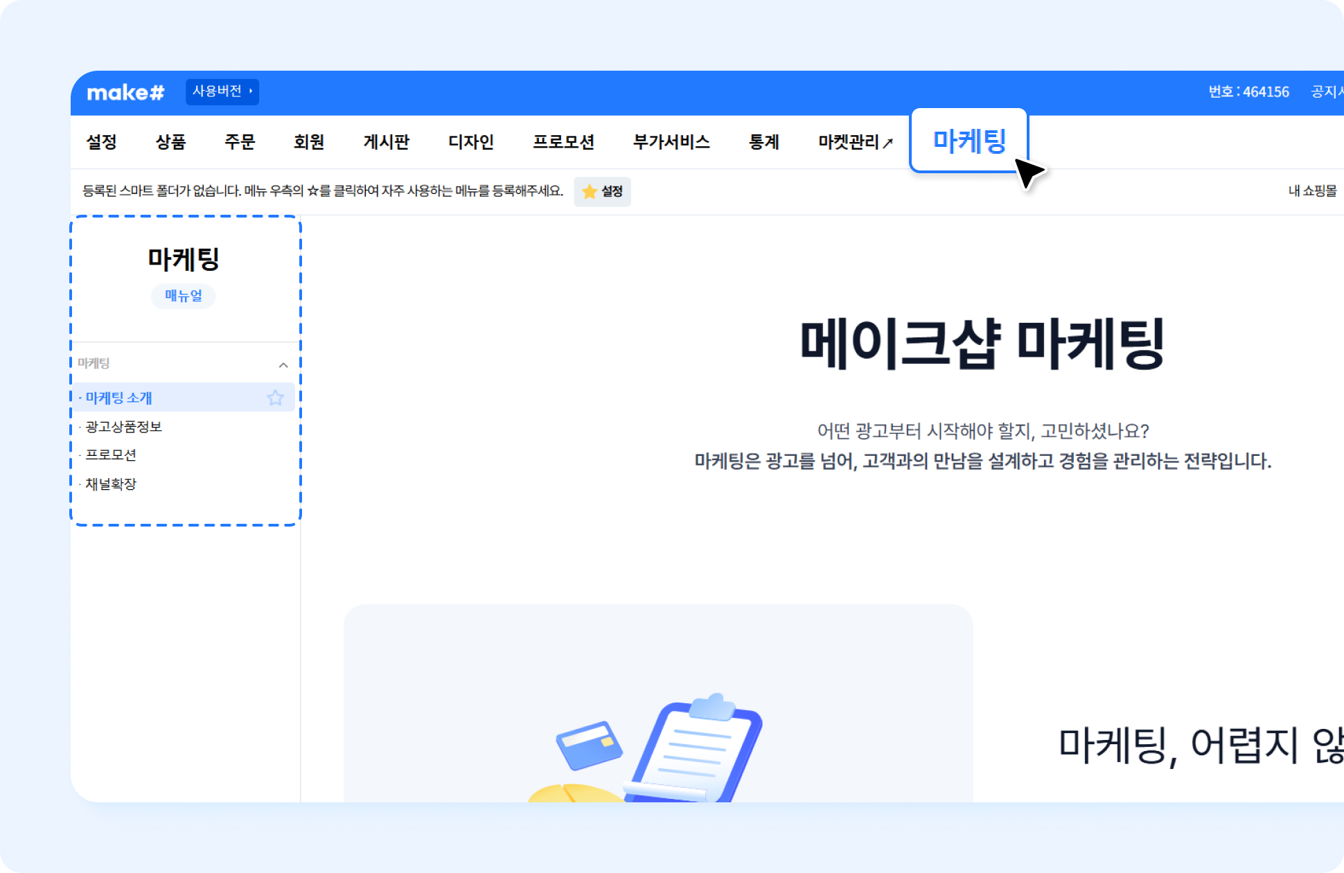 ¡¤ ¸ÞÀÌÅ©¼¥ °ü¸®ÀÚ ÆäÀÌÁö¸¦ ·Î±×ÀÎÇÏ½Ã¸é »ó´ÜÀÇ [¸¶ÄÉÆÃ] ¸Þ´º¸¦ Ŭ¸¯ÇØ ÁÖ¼¼¿ä.
