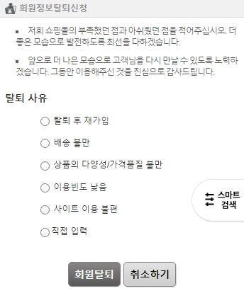 ¼îÇθô±¸Ãà > ¼îÇθô °ü¸®±â´É ¼³Á¤ > ȸ¿ø °ü·Ã Ư¼öÁ¶°Ç ¼³Á¤ > ȸ¿ø Å»Åð »çÀ¯ Ç׸ñ ¼³Á¤