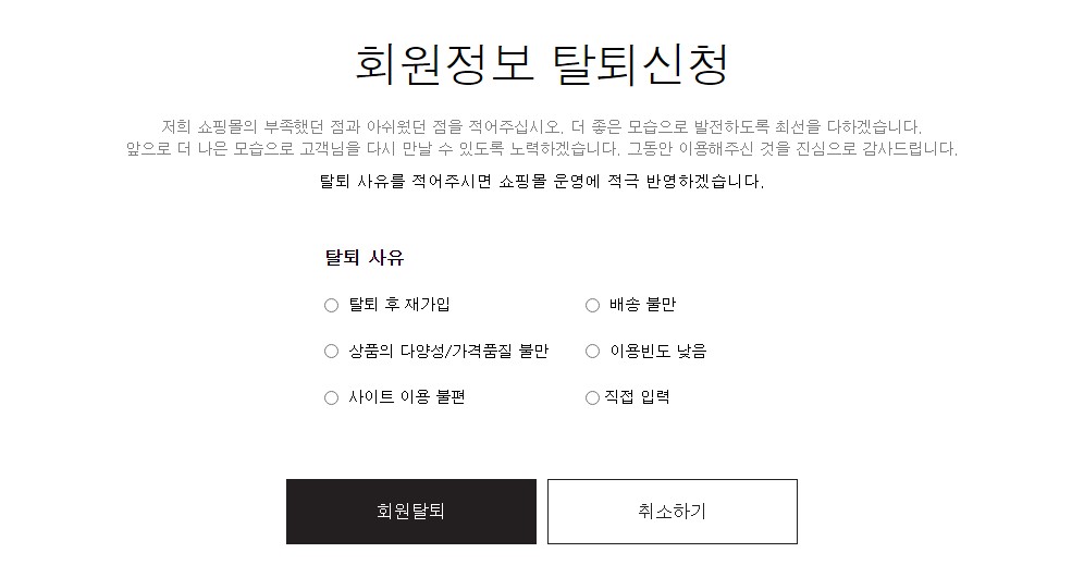 °í°´ÀÌ È¸¿ø Å»Åð ½Ã Á÷Á¢ ÀÔ·ÂÇÏÁö ¾Ê°í, ¿øÅ¬¸¯À¸·Î Å»Åð »çÀ¯¸¦ ¼±ÅÃÇÒ ¼ö ÀÖ½À´Ï´Ù.