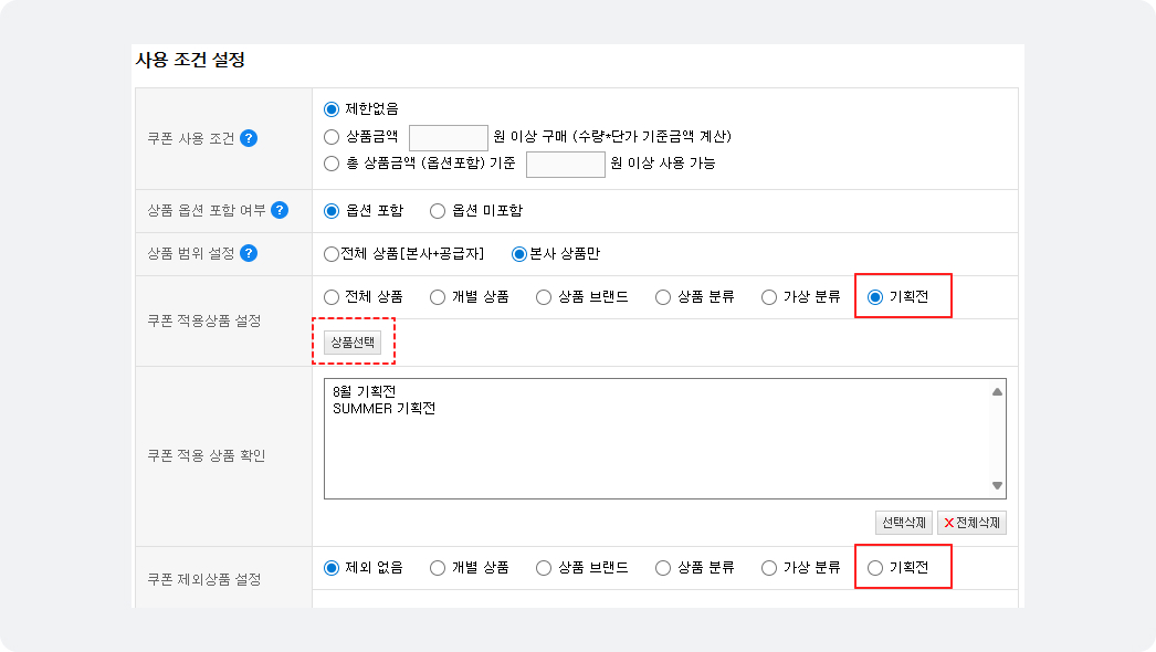 • 'ÄíÆù Àû¿ë»óǰ ¼³Á¤' / 'ÄíÆù Á¦¿Ü»óǰ ¼³Á¤'¿¡¼ '±âȹÀü' üũ ¡æ [»óǰ¼±ÅÃ] ¹öưÀ» ÅëÇØ ±âȹÀüÀ» Ãß°¡ÇØÁÖ¼¼¿ä.
