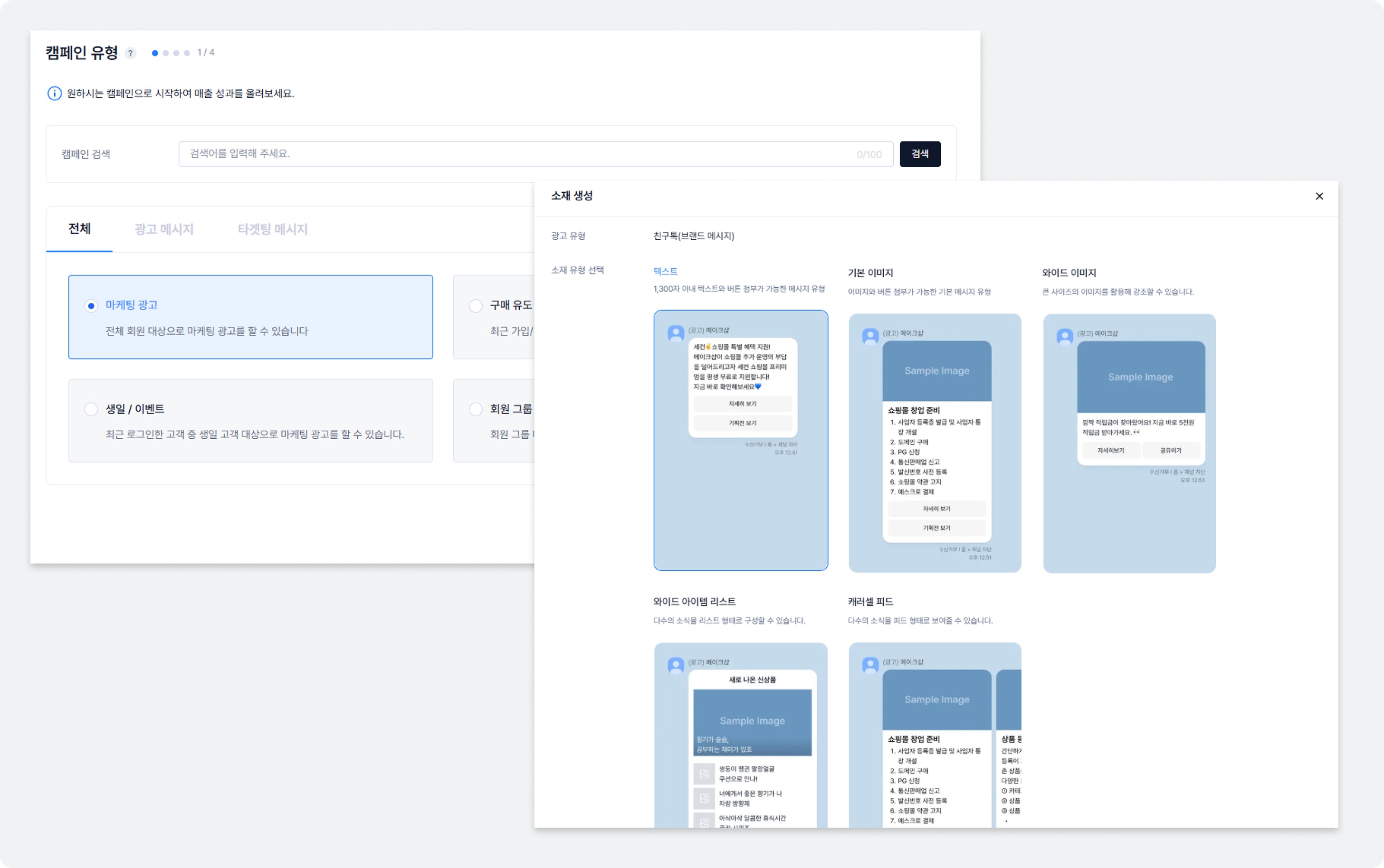 • ¸¶ÄÉÆÃ È¿°ú¸¦ ³ôÀÏ ¼ö ÀÖ´Â ±¤°í ¸Þ½ÃÁö¿Í ȸ¿ø Ư¼º¿¡ ¸ÂÃá Ÿ°ÙÆÃ ¸Þ½ÃÁö µî ¿Àµð¾ð½º¿¡ µû¶ó Ä·ÆäÀÎÀ» ¸¸µé¾î ¹ß¼ÛÇÒ ¼ö ÀÖ¾î¿ä.